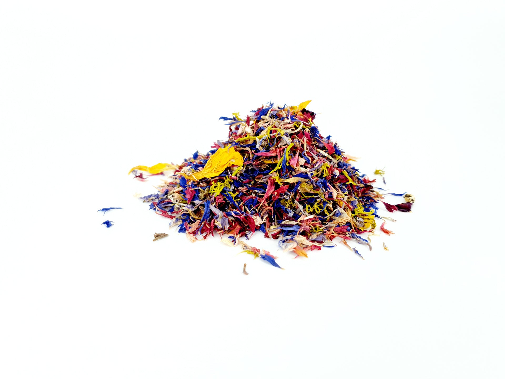 En farverig blanding af blomsterblade og mos: blå og røde kornblomster, roser, solsikker og lysegrønt mos er omhyggeligt udformet til eksklusive naturlige overflader. Hele processen er underlagt streng kvalitetskontrol.